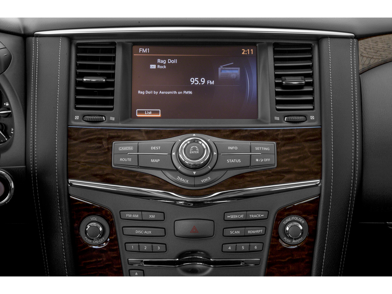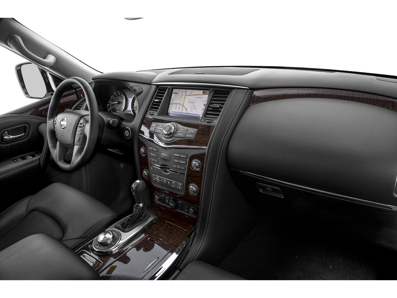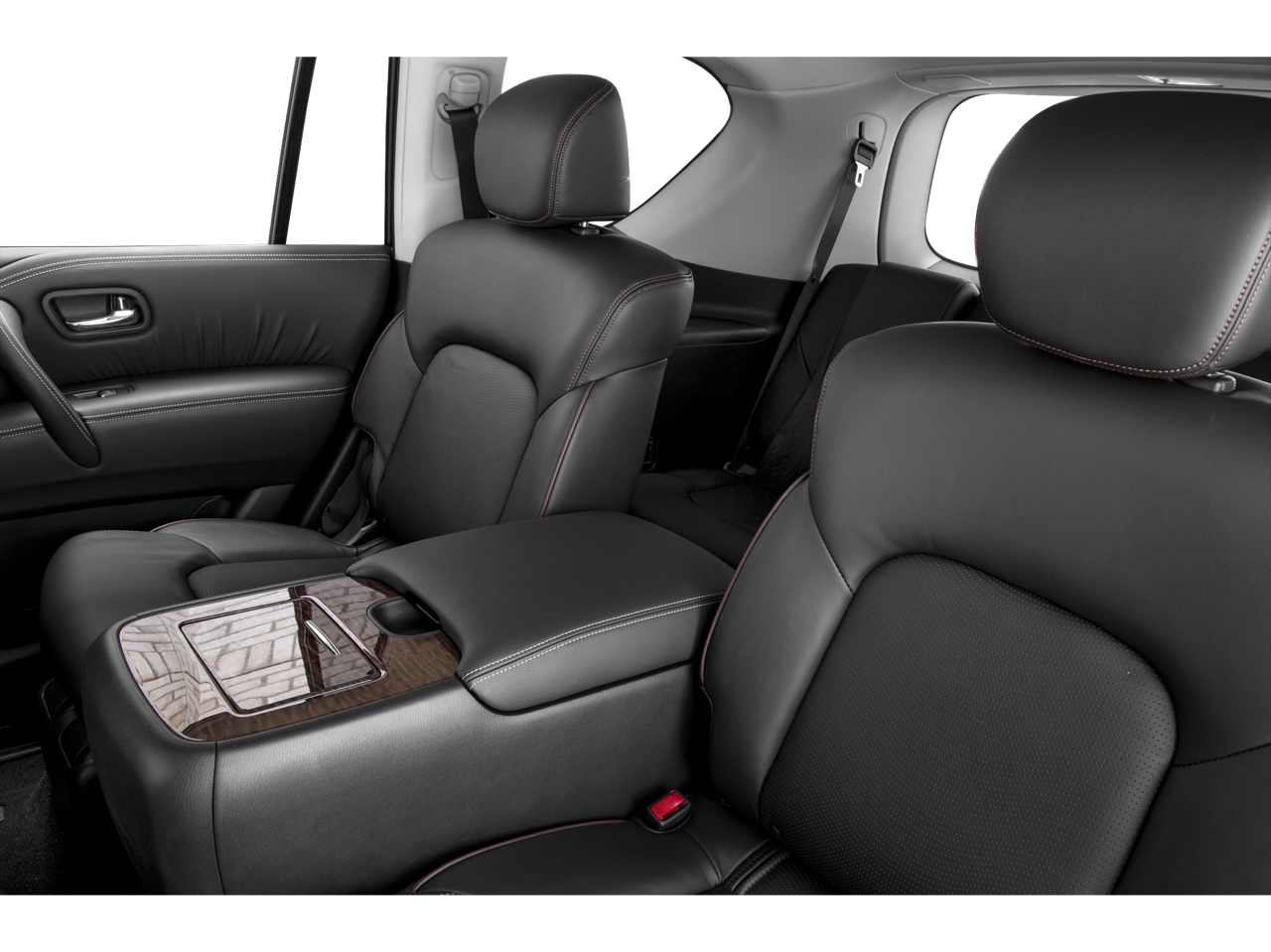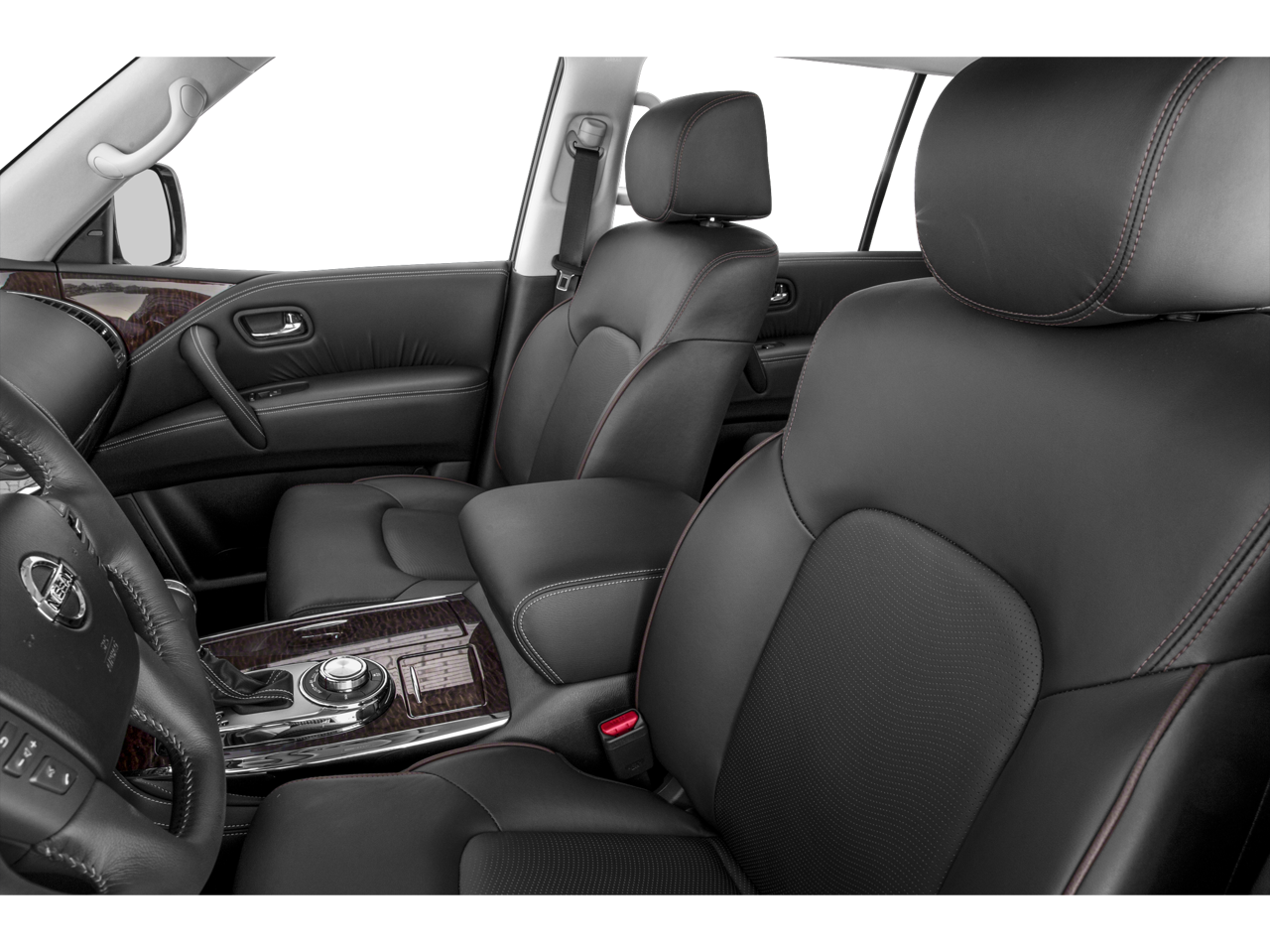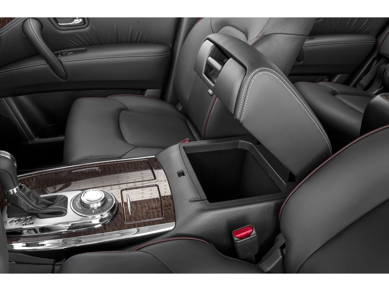 13 Speakers, 2.937 Axle Ratio, 3rd row seats: split-bench, 4-Wheel Disc Brakes, A/V remote, ABS brakes, Air Conditioning, Alloy wheels, AM/FM radio: SiriusXM, Anti-whiplash front head restraints, Auto tilt-away steering wheel, Auto-dimming door mirrors, Auto-dimming Rear-View mirror, Auto-leveling suspension, Automatic temperature control, Brake assist, Bumpers: body-color, Captain Seat Package, Cargo Package, Carpeted Floor Mats w/ Captain Seat Package, CD player, Delay-off headlights, Driver door bin, Driver vanity mirror, Dual front impact airbags, Dual front side impact airbags, Electronic Stability Control, Emergency communication system: NissanConnect Services, Four wheel independent suspension, Front anti-roll bar, Front Bucket Seats, Front Center Armrest, Front dual zone A/C, Front fog lights, Front reading lights, Fully automatic headlights, Garage door transmitter: HomeLink, Headphones, Heated & Cooled Front Bucket Seats w/Driver Memory, Heated door mirrors, Heated front seats, Heated rear seats, Heated steering wheel, Illuminated entry, Lane Departure Warning System, Leather Shift Knob, Leather-Appointed Seat Trim, Low tire pressure warning, Memory seat, Navigation System, Occupant sensing airbag, Outside temperature display, Overhead airbag, Overhead console, Panic alarm, Passenger door bin, Passenger vanity mirror, Power door mirrors, Power driver seat, Power Liftgate, Power moonroof, Power passenger seat, Power steering, Power windows, Radio data system, Radio: Bose AM/FM/SXM/CD/MP3/HD Radio, Rain sensing wipers, Rear air conditioning, Rear anti-roll bar, Rear reading lights, Rear seat center armrest, Rear window defroster, Rear window wiper, Reclining 3rd row seat, Remote keyless entry, Roof rack: rails only, Second Row Captain's Chairs, Second Row Center Console w/ Padded Armrest, Security system, Speed control, Speed-sensing steering, Speed-Sensitive Wipers, Split folding rear seat, Spoiler, Steering wheel memory, Steering wheel mounted audio controls, Tachometer, Telescoping steering wheel, Tilt steering wheel, Traction control, Trip computer, Turn signal indicator mirrors, Variably intermittent wipers, Ventilated front seats, Voltmeter, Wheels: 20 Machine-Faced Chrome w/Tinted CC.