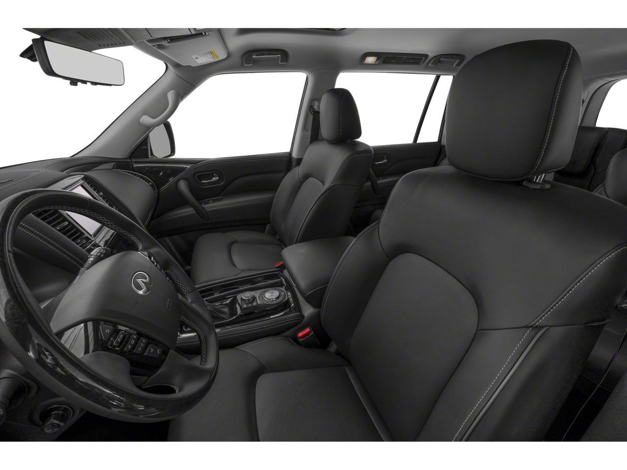 13 Speakers, 2.937 Axle Ratio, 20 Aluminum Alloy Wheels, 3rd row seats: bench, 4-Wheel Disc Brakes, ABS brakes, Air Conditioning, Alloy wheels, AM/FM radio: SiriusXM, Anti-whiplash front head restraints, Apple CarPlay/Android Auto, Auto High-beam Headlights, Auto tilt-away steering wheel, Auto-dimming door mirrors, Auto-dimming Rear-View mirror, Auto-leveling suspension, Automatic temperature control, Brake assist, Bumpers: body-color, Compass, Delay-off headlights, Driver door bin, Driver vanity mirror, Dual front impact airbags, Dual front side impact airbags, Electronic Stability Control, Emergency communication system: INFINITI InTouch, Four wheel independent suspension, Front anti-roll bar, Front Bucket Seats, Front Center Armrest, Front dual zone A/C, Front fog lights, Front reading lights, Fully automatic headlights, Garage door transmitter: HomeLink, Heated door mirrors, Heated Front Bucket Seats, Heated front seats, Heated steering wheel, Illuminated entry, Leather Shift Knob, Leather steering wheel, Leather-Appointed Seats, Literature Kit, Low tire pressure warning, Memory seat, Navigation system: INFINITI InTouch Navigation, Occupant sensing airbag, Outside temperature display, Overhead airbag, Overhead console, Panic alarm, Passenger door bin, Passenger vanity mirror, Power door mirrors, Power driver seat, Power Liftgate, Power moonroof, Power passenger seat, Power steering, Power windows, Radio data system, Radio: Bose Premium Audio System w/13 Speakers, Rain sensing wipers, Rear air conditioning, Rear anti-roll bar, Rear reading lights, Rear seat center armrest, Rear window defroster, Rear window wiper, Reclining 3rd row seat, Remote keyless entry, Security system, Speed control, Speed-sensing steering, Split folding rear seat, Spoiler, Steering wheel memory, Steering wheel mounted audio controls, Tachometer, Telescoping steering wheel, Tilt steering wheel, Traction control, Trip computer, Turn signal indicator mirrors, Variably intermittent wipers, Voltmeter.